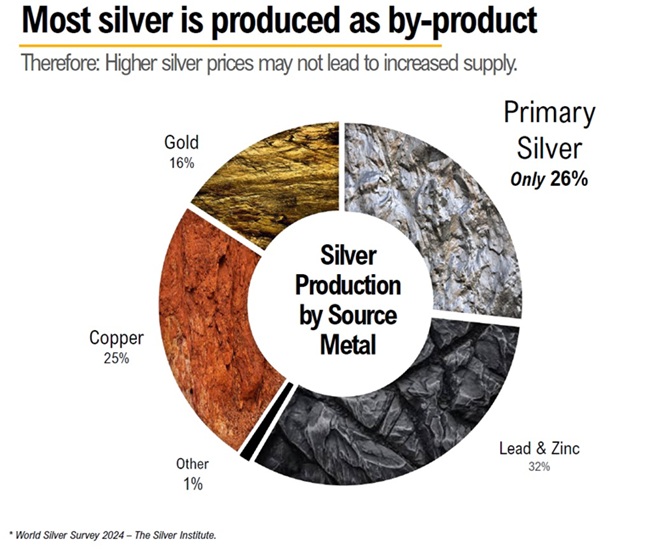 Doch zurück auf Los. Der Silbermarkt befindet sich bereits seit Jahren im Defizit. Sprich: Es wird nicht genug Silber durch Bergbau oder Recycling bereitgestellt, um den Bedarf der Industrie oder der Juweliere zu decken. Laut dem Silver Institute wird das Defizit in diesem Jahr bei rund 149 Mio. Unzen liegen (siehe hier). Der Gesamtmarkt entspricht rund 1,05 Mrd. Unzen Silber; der Mangel ist mit deutlich mehr als 10 Prozent also nicht unerheblich. Das geschieht, obwohl die Minenproduktion auch dieses Jahr wächst und mit 844 Mio. Unzen ein Siebenjahreshoch erreichen dürfte (siehe hier). Und da fangen die Probleme an: Denn eine gesteuerte Silberproduktion gibt es nicht. Etwa 25 Prozent der Förderung stammt tatsächlich aus Silberminen. Die anderen drei Viertel an Silber werden als Beiprodukt, hauptsächlich in Gold-, Zink- oder Kupferminen gewonnen, wie die folgende Graphik zeigt:
